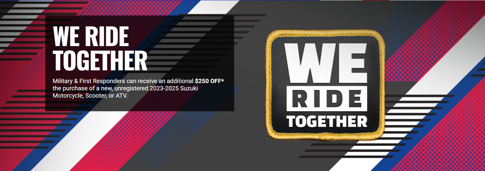 *Conditions apply. This offer is valid for $250 factory customer cash off a new, unregistered 2023-2026 Suzuki motorcycle, scooter, or ATV model. Discount is taken off of listed price and is contingent on model availability. Offer must be validated by participating authorized dealer at time of purchase. May be combined with other current retail incentives so long as all conditions are met. No substitutions. Offer applicable to active and retired first responders in law enforcement, fire and rescue services, or emergency medical services (First Responder) or an active or retired member of the United States Armed Forces (Military). Military and first responders may be required to provide verification of status. See dealer for eligibility. Not redeemable for cash. Offers void where prohibited. Only valid in the continental United States, excluding HI. See your local Suzuki dealer for complete details. Offer valid between 10/01/2025 and 12/31/2025.