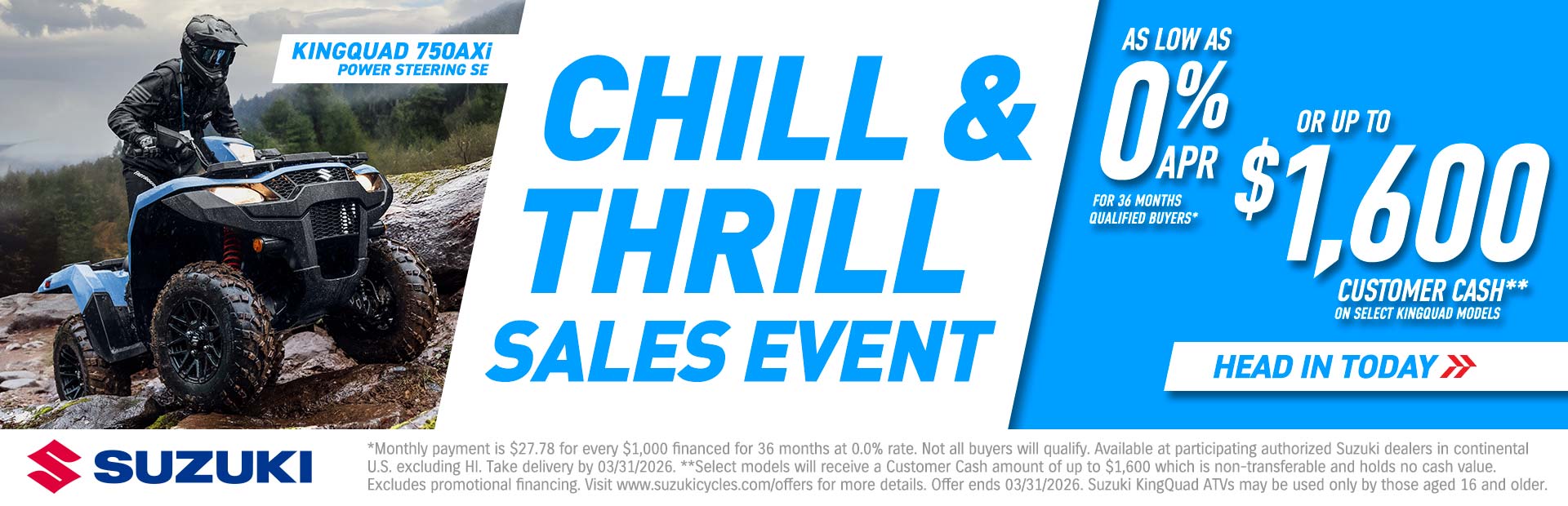 As low as 8.99% APR financing for 60 months on new and unregistered Qualifying Model is available through Sheffield Financial, a division of Truist Bank. Member FDIC. Program minimum amount financed is $1,500; Maximum Amount Financed $75,000. Not all buyers will qualify. Approval, and any rates and terms provided, are based on credit worthiness. Other financing offers are available. $20.75 per $1,000 financed monthly payments required over a 60-month term at an 8.99% rate. Example: On a purchase where the Amount Financed is $7,500, your Down Payment is $0 with 60 monthly payments of $156.00 each. Interest Rate is 8.99% [ANNUAL PERCENTAGE RATE is 8.99%]. Financing promotions void where prohibited. See your local Suzuki dealer for details. Only valid in continental United States, excluding HI. Offer effective from a participating authorized Suzuki dealer between 01/01/2026 and 03/31/2026. All offers on 2023 models expire 03/13/2026. Offer subject to change without notice.